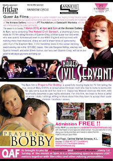 At 4pm, we're screening The Naked Civil Servant, a charmingly funny made-for-TV film telling the story of Quentin Crisp, a British queer icon and writer, who was openly homosexual even in pre-WWII England and survived with nothing more than mascara, sharp wit and a sheer force of personality. John Hurt (The Elephant Man, V For Vendetta) stars in this career-defining award-winning role in this 1975 BBC classic. Film critic Benjamin McKay, who has met Quentin himself, and actor Edwin Sumun, our very own Quentin Crisp, will be on our panel to talk about gay icons and being out.